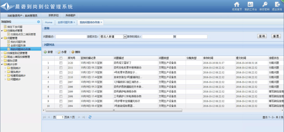 晨砻到岗到位管理系统是通过现代化的技术手段,搭建生产人员到岗到位管理平台,通过梳理电厂现场监管的地点区域及班组区域,对每个区域制作唯一二维码标签,贴在相应的地点位置,生产人员到达相应的地点后通过手持终端(或智能手机)读取标签上的相关数据,在手持终端填写发现的问题,同时可以拍照上传相应的问题照片,对相关信息通过手机端APP第一时间进行上传。