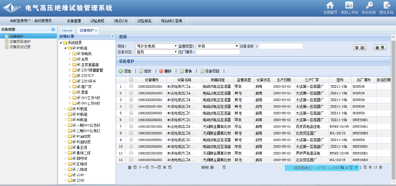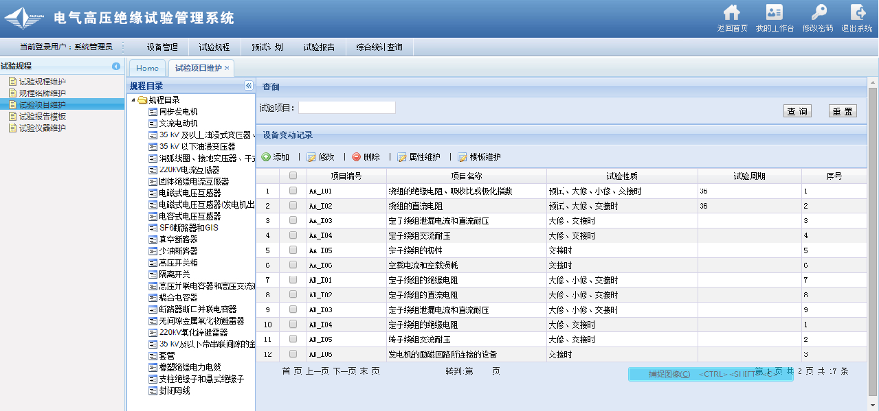 可以进行设备铭牌的维护和查询。即方便的查看和维护某一试验规程对应哪些预试验高压电气设备。每个预试验规程包含不只一个试验项目,系统可以进行预试验项目的维护和查询。试验项目内容包括试验性质、试验周期、试验标准、试验说明等。