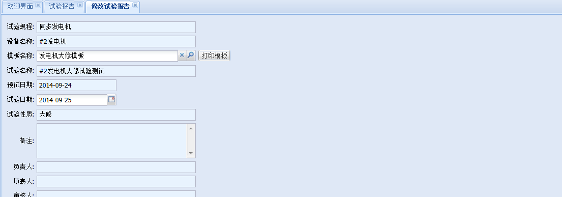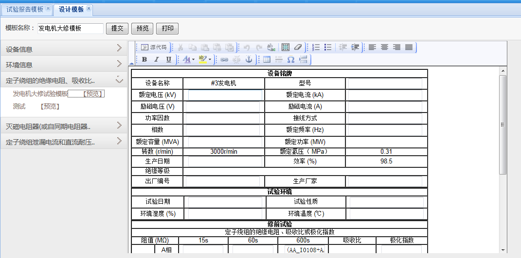 根据设备铭牌和试验项目系统自动生成试验报告模板,试验报告基本信息不需手工输入,如设备名称、试验标准、试验说明等。试验报告模板,用户可以自己设计模板格式,本系统的自定义报告模板区别于传统软件自定义报告模板只能把内容前后顺序改动或者增改打印项目的多少。使用本系统用户从表头到表尾自行设计,如在EXCEL里做一个新的表格。
