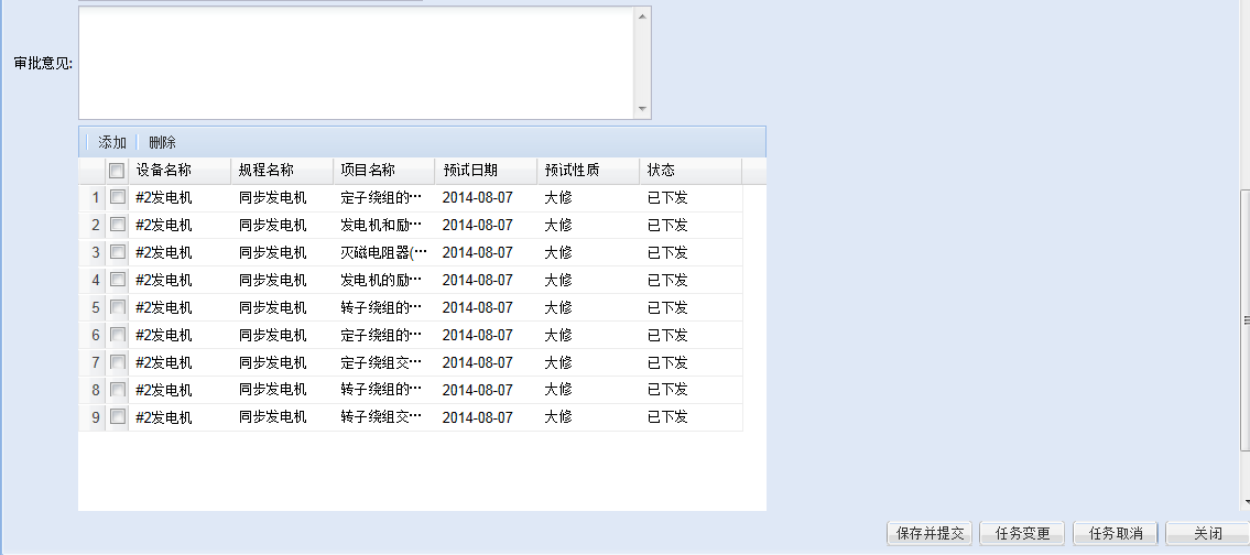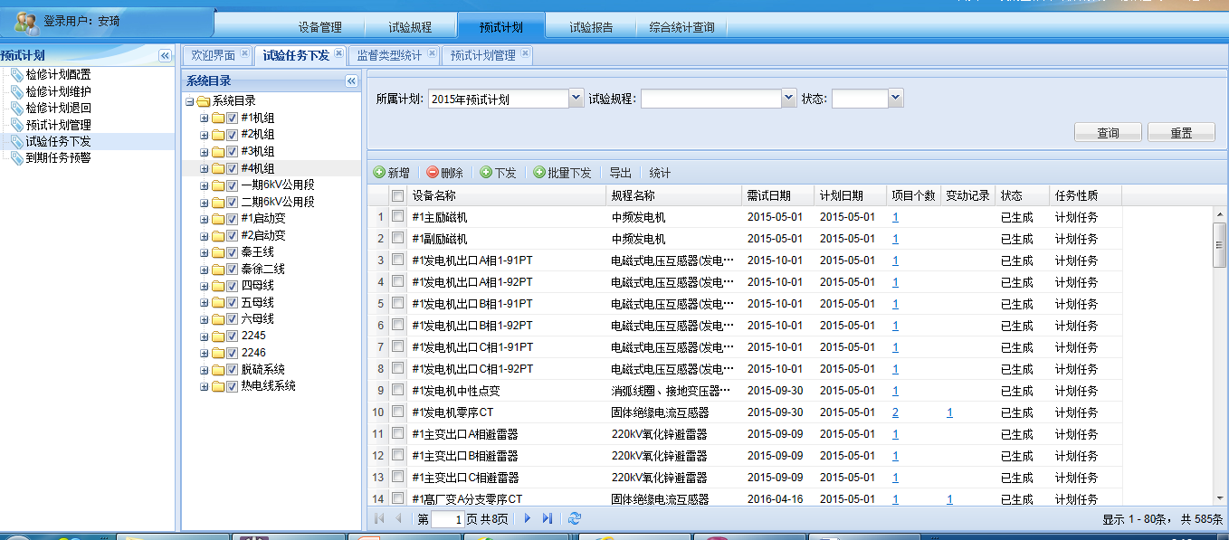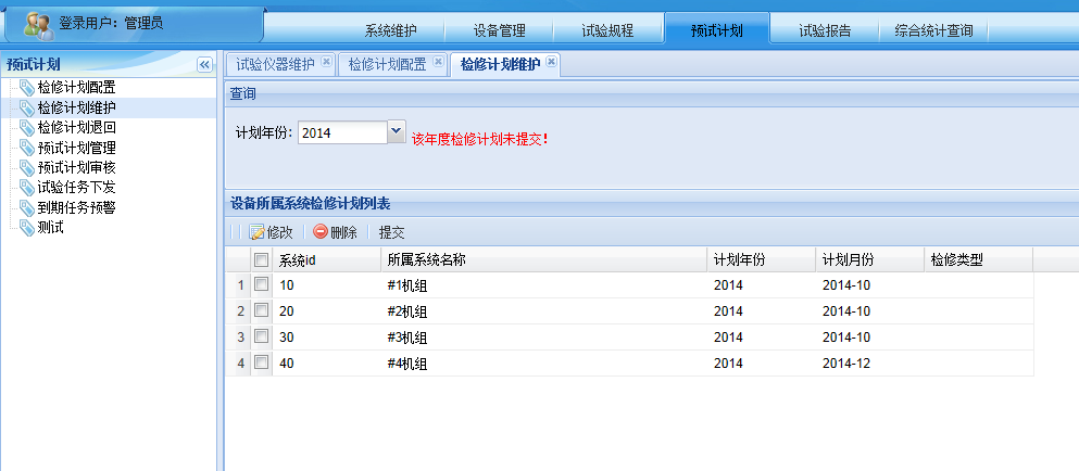年度预试验计划是电气试验班根据年度大修计划、挂接需要试验的电气设备,结合每个设备上次试验时间和试验项目周期生成的,年度预试验计划需要逐级审批才能生效,系统设计了审批流程。