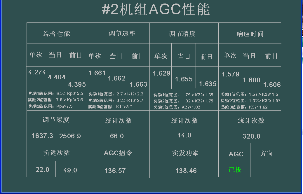 AGC的性能指标是通过算法计算得到的,并像机组的汽温、汽压、水位等调节系统,通过被调量的偏差和响应程度,就可比较直观地了解控制系统的工作状况;而网局公布的日平均综合指标,并不能说明某次AGC负荷调整的结果;对热工维护人员改进控制策略,优化控制系统调节参数的工作的指导意义,只能停留在“大面”上,而不能具体到某次调整上;使分析原因、总结经验的工作变得困难。定位各单次调节的调节品质可以更好的分析原因。