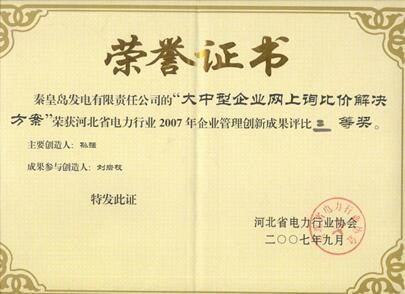 公司的招投标系统被河北省电力行业协会授予:河北省企业管理创新成果一等奖。
