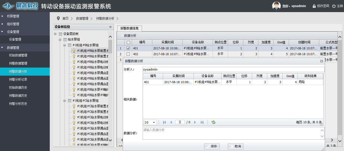 3、通过对现场测量值录入与相应设备振动报警逻辑算法关联,由系统进行报警判断,并输出报警结果;