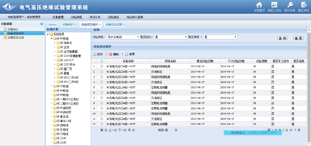 可以进行设备铭牌的维护和查询。即方便的查看和维护某一试验规程对应哪些预试验高压电气设备。每个预试验规程包含不只一个试验项目,系统可以进行预试验项目的维护和查询。试验项目内容包括试验性质、试验周期、试验标准、试验说明等。